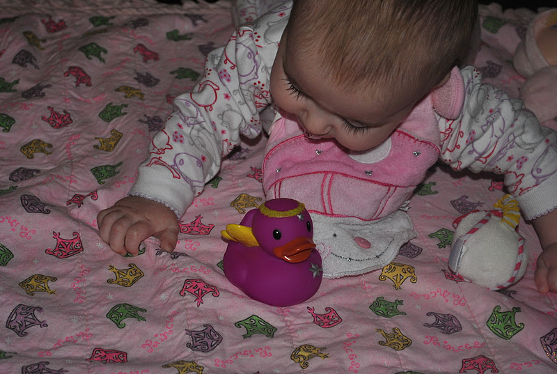 Madi got the cutest little carousel wobble thing, clothes, silver sprakly Toms, a soft pull toy dog, pajamas, and a peek-a-boo book!